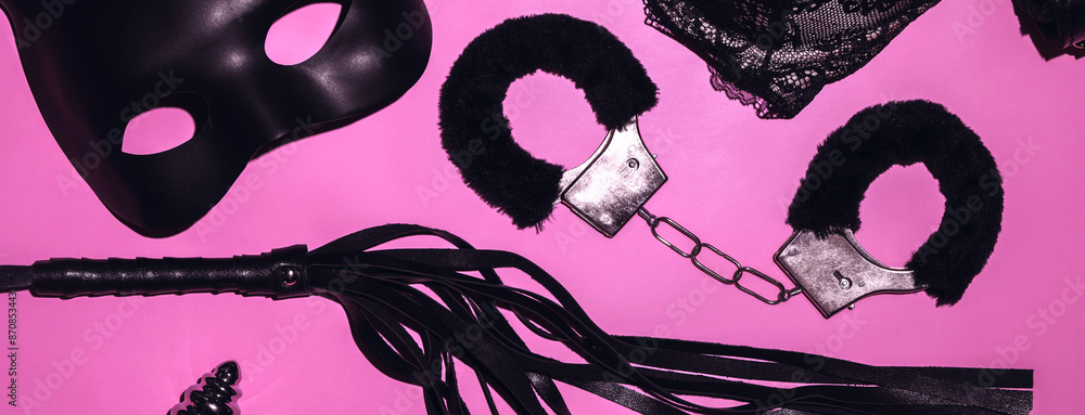 set of BDSM sex toys with handcuffs, whip flogger for submission and domination on a pink background. Wide header cover for a horizontal banner for sex shop