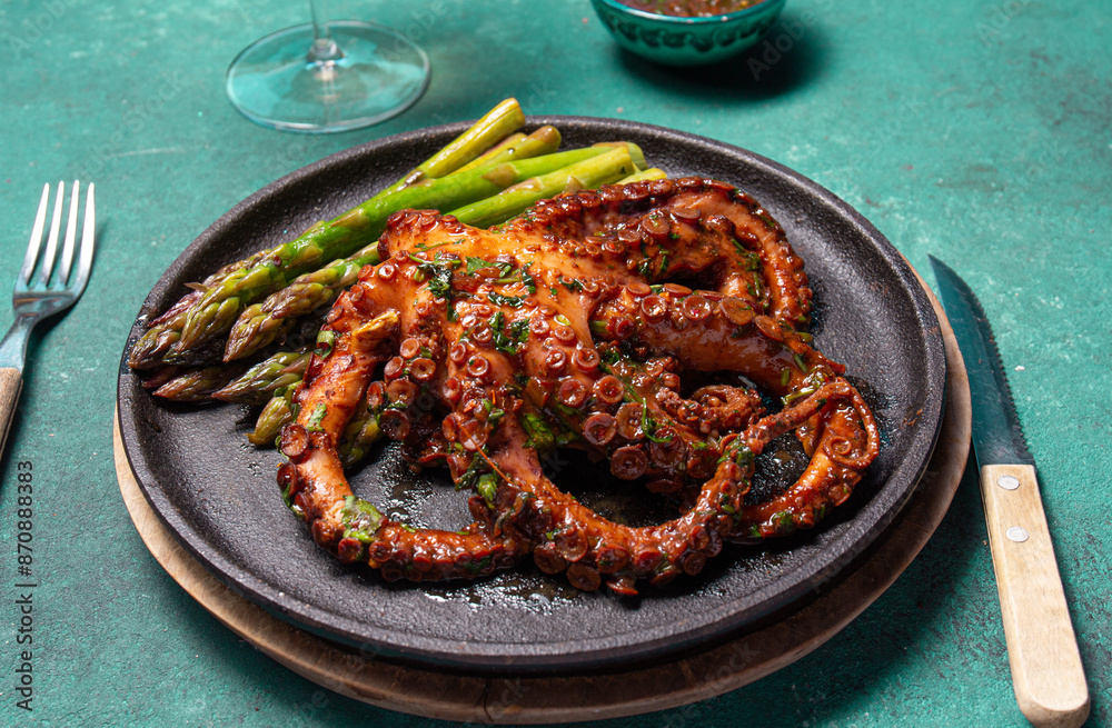 Grilled octopus with asparagus served on a black plate, highlighting vibrant colors and textures against a turquoise background.