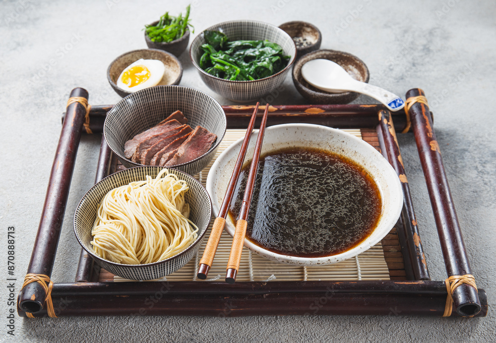 Ingredients for ramen displayed on a light background include ramen noodles, soft-boiled egg, sliced meat, spinach