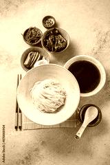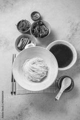 Ingredients for ramen displayed on a light background include ramen noodles, soft-boiled egg, sliced meat, spinach