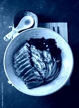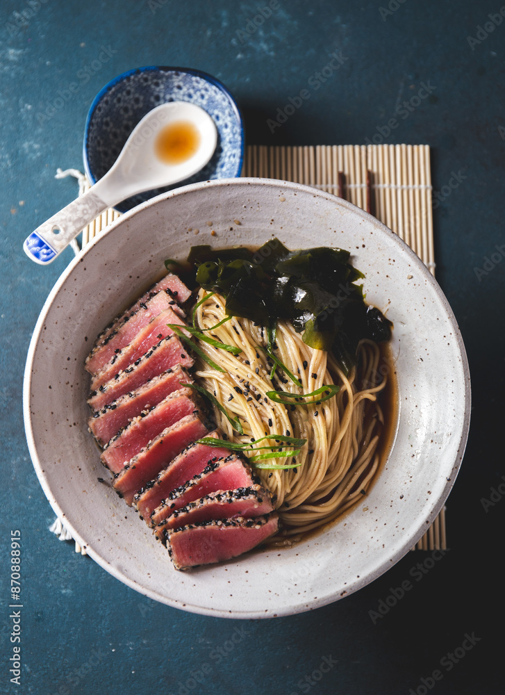 A bowl of ramen featuring perfectly seared tuna slices, garnished with fresh greens, seaweed, and served in a savory broth.