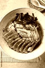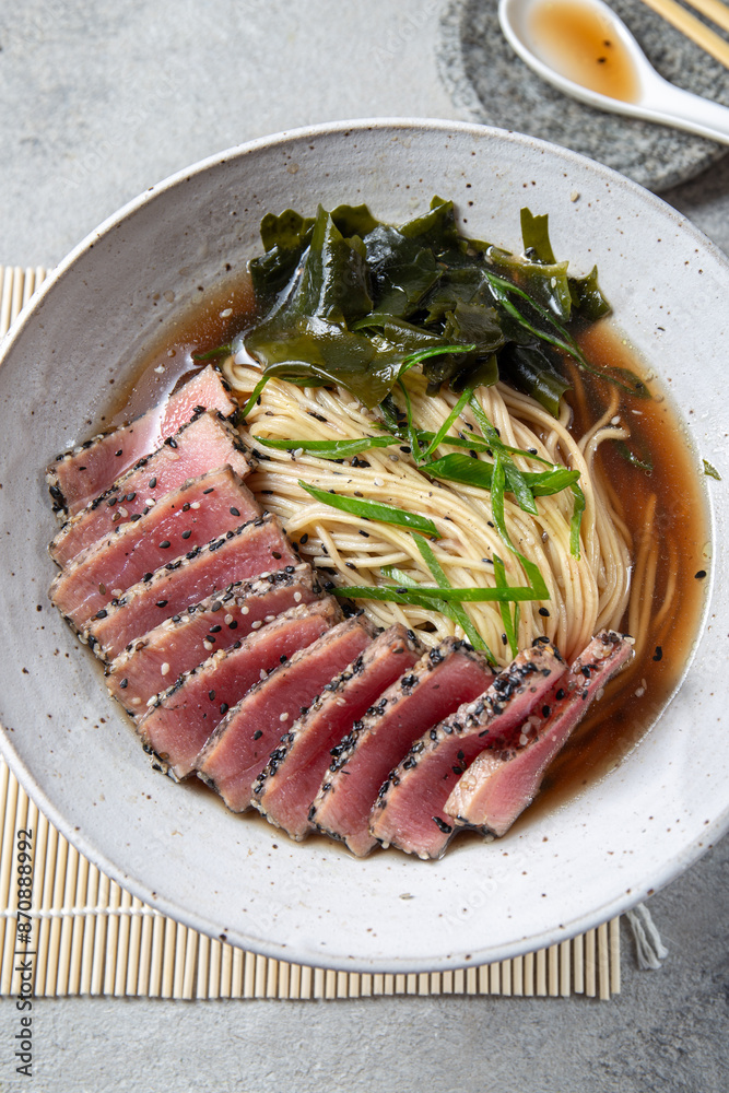 A bowl of ramen featuring perfectly seared tuna slices, garnished with fresh greens, seaweed, and served in a savory broth.