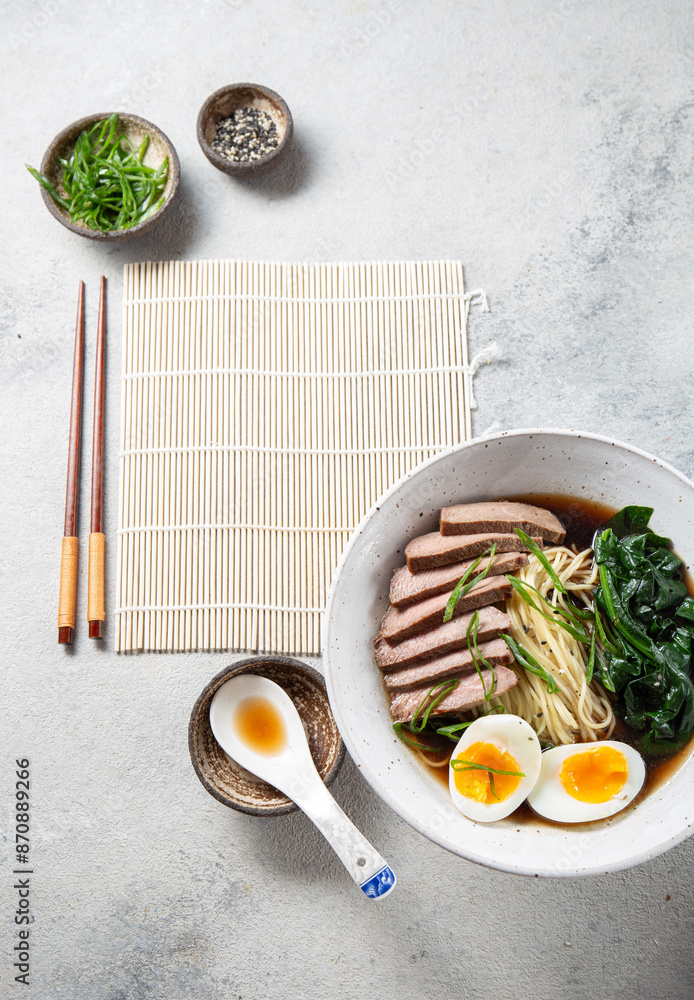 A bowl of ramen with slices of beef, soft-boiled egg halves, and green vegetables. The meal is garnished with green onions