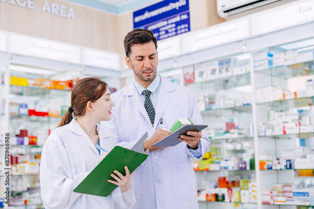 Pharmacy working people team stuff standing talking together in drugstore, Pharmacist male and female working cooperate.