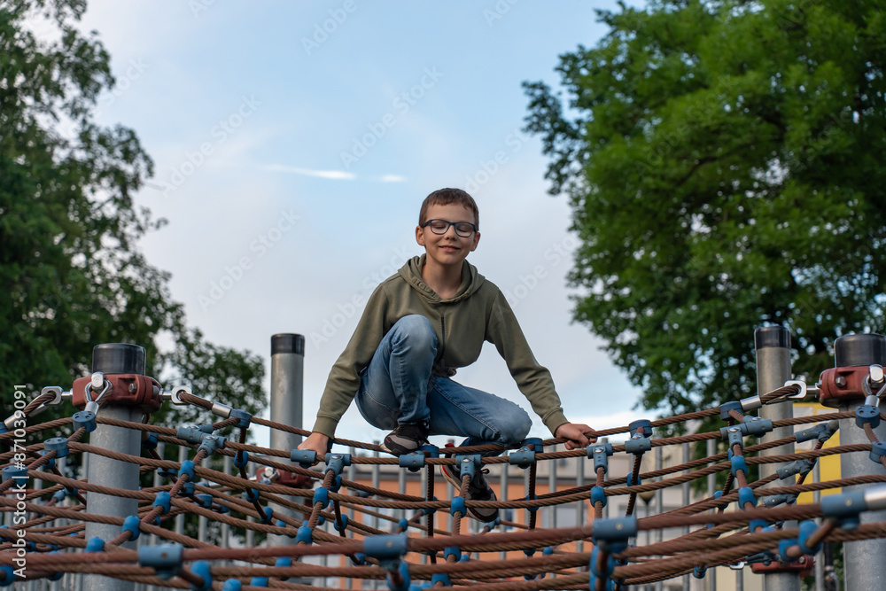 Boy 8-10 years old on the sports ground. Active rest, holidays, summer. High quality photo