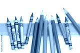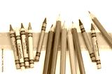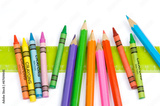 Ruler and Crayon Border – A green ruler, with crayons and colored pencils. On a white background.