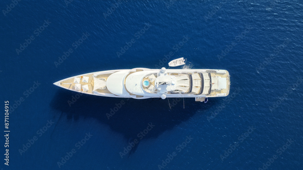 Aerial drone top down photo of luxury yacht with wooden deck anchored in deep blue Aegean sea, Mykonos island, Cyclades, Greece