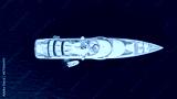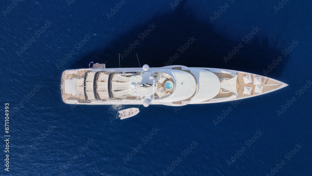 Aerial drone top down photo of luxury yacht with wooden deck anchored in deep blue Aegean sea, Mykonos island, Cyclades, Greece