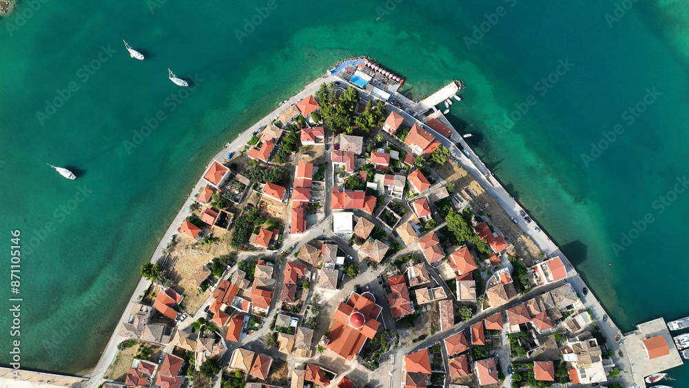 Aerial drone top down photo of famous picturesque marine village of Galaxidi, Fokida, Greece