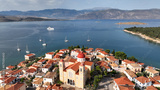 Aerial drone top down photo of famous picturesque marine village of Galaxidi, Fokida, Greece