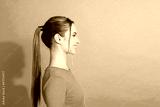 Side profile photo of nice woman with foxy hairstyle wear orange crop top look at sale empty space isolated on turquoise color background