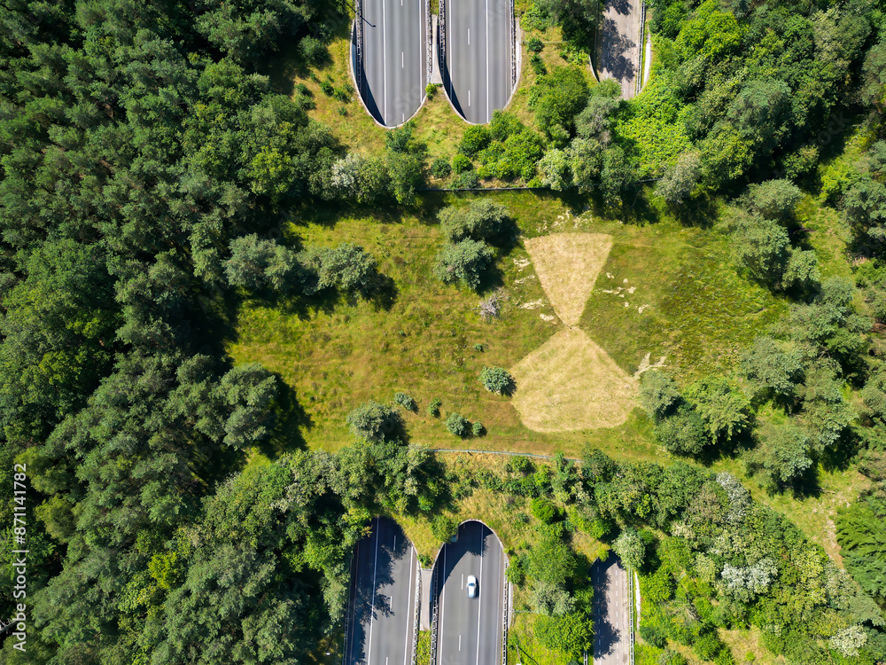 An aerial view of a wildlife overpass near Woeste Hoeve in Gelderland, Netherlands