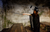 Halloween Witch woman portrait. Black hat with long hair in an interior room.