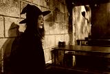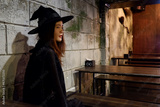 Halloween Witch woman portrait. Black hat with long hair in an interior room.