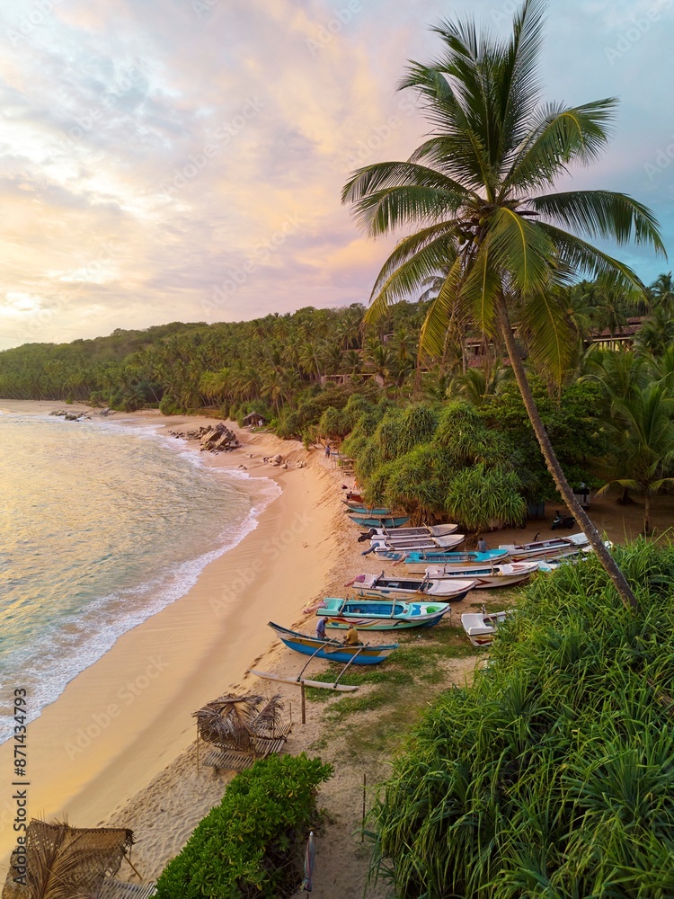 A tropical sand beach with fishing boats and palms, overgrown with jungle