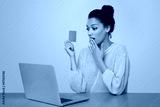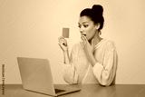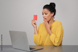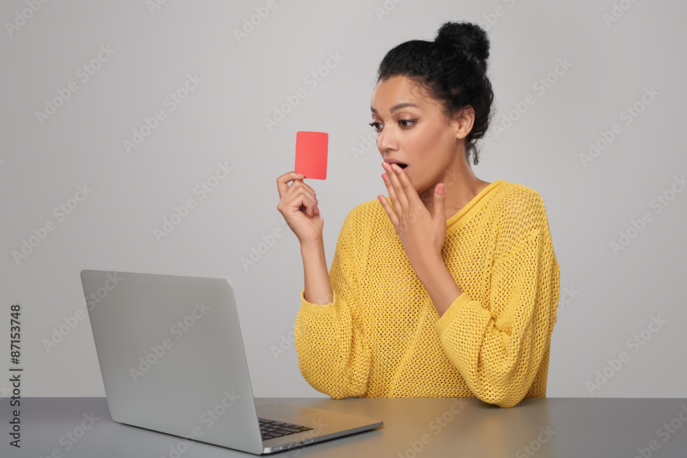 Surprised mixed race african american - caucasian woman with laptop computer holding blank credit card, sitting at table, over gray background