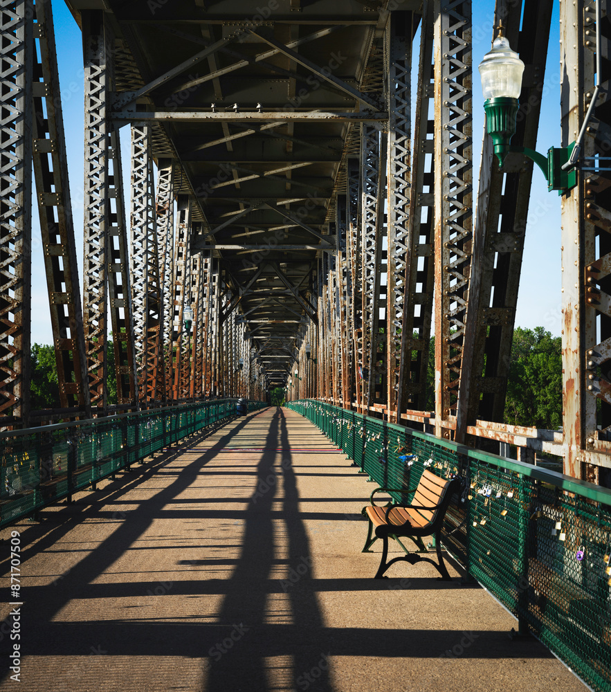The Landmark Meridian Bridge with Bench across the Missouri River in Yankton: The double-deck bridge, opened in 1924, connecting Nebraska and South Dakota