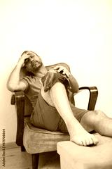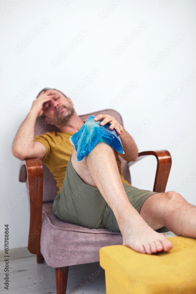 Man with painful knee and leg injury at home cooling down with ice pack.