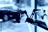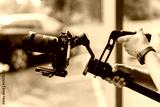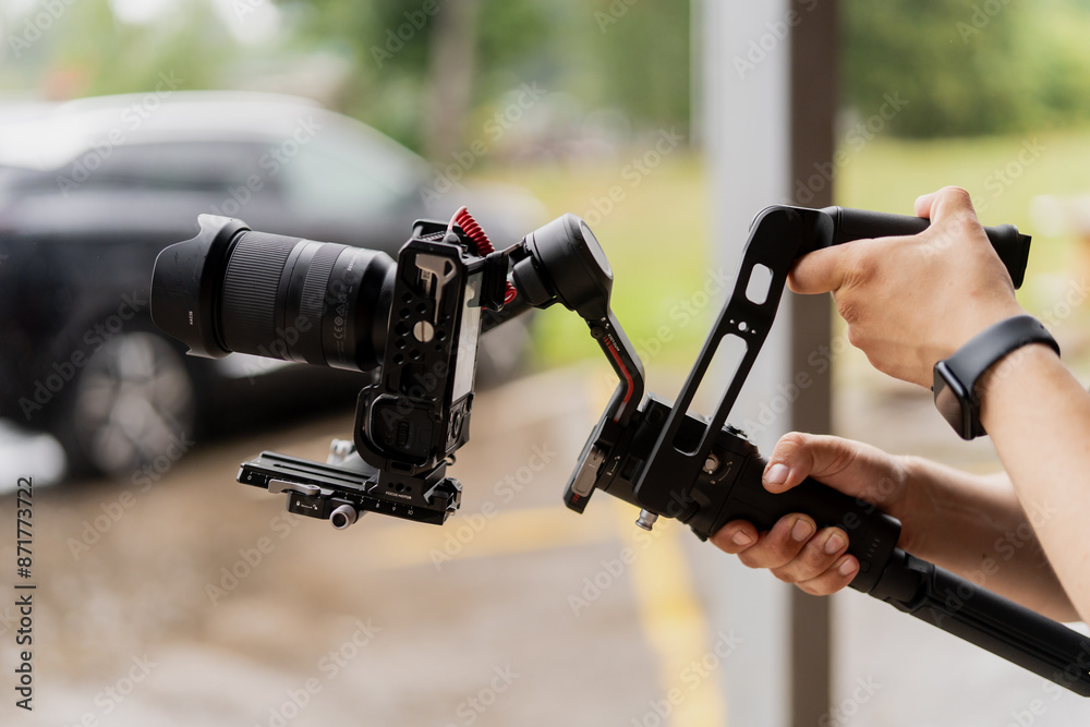 Big digital camera stabilization riga with filming professional arms close up