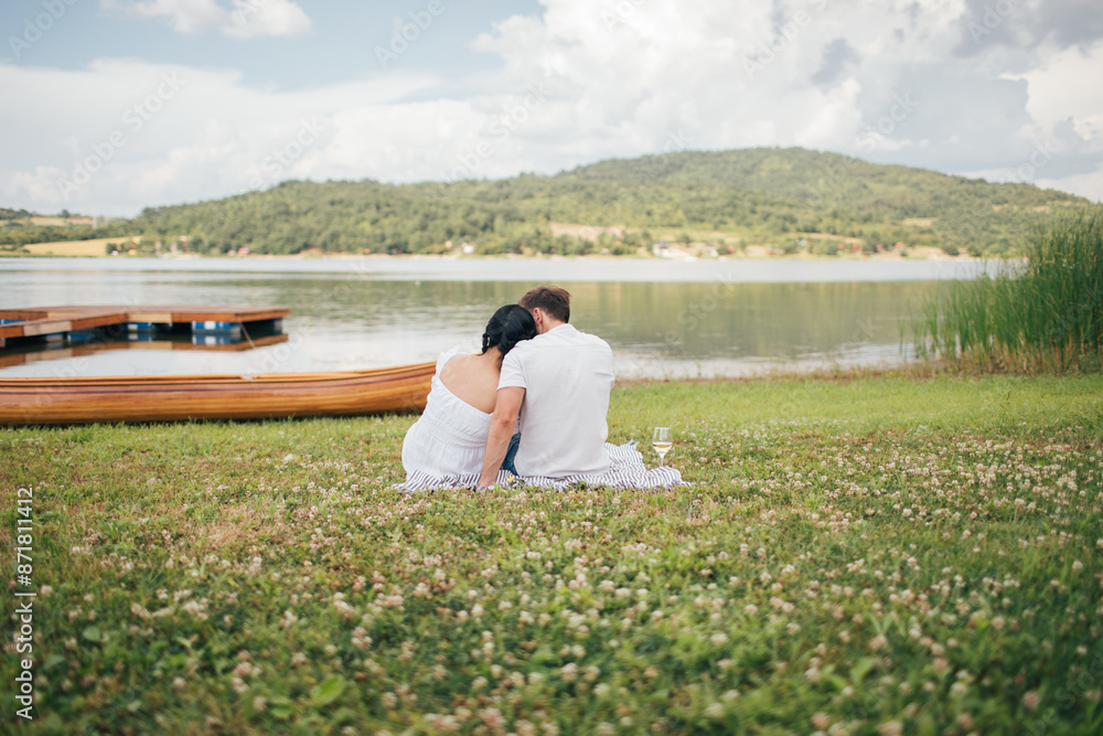 Rear view of young couple having picnic by the lake