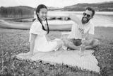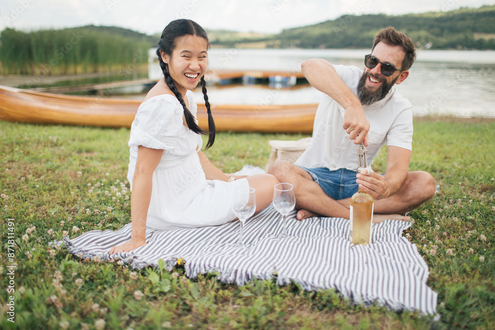 Young married couple enjoying picnic time with wine