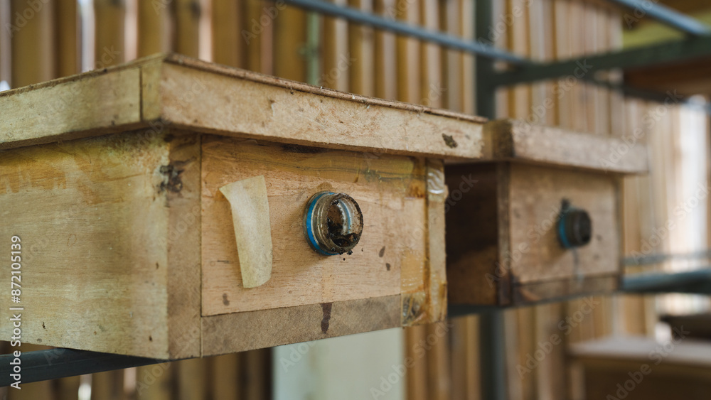 A box of stingless bees on shelf in honey bee farm, Agrotourism and ecotourism business, sustainability local job, eco-friendly bee farming, native species, medicinal honey, biology in agricultural.