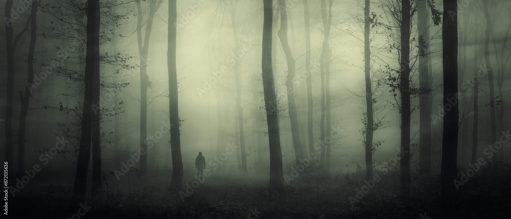 man silhouette in dark fantasy landscape, halloween forest panorama