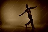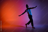 A young African American man dances with energy and grace against a vibrant gradient backdrop.