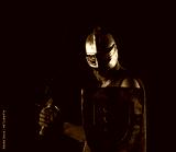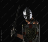 portrait of a male knight in chain mail with a sword and shield on a black background
