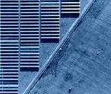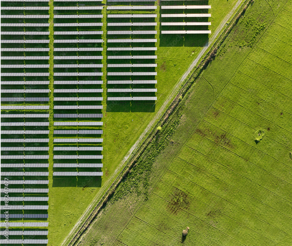 Solar panels on field in summer, aerial drone view