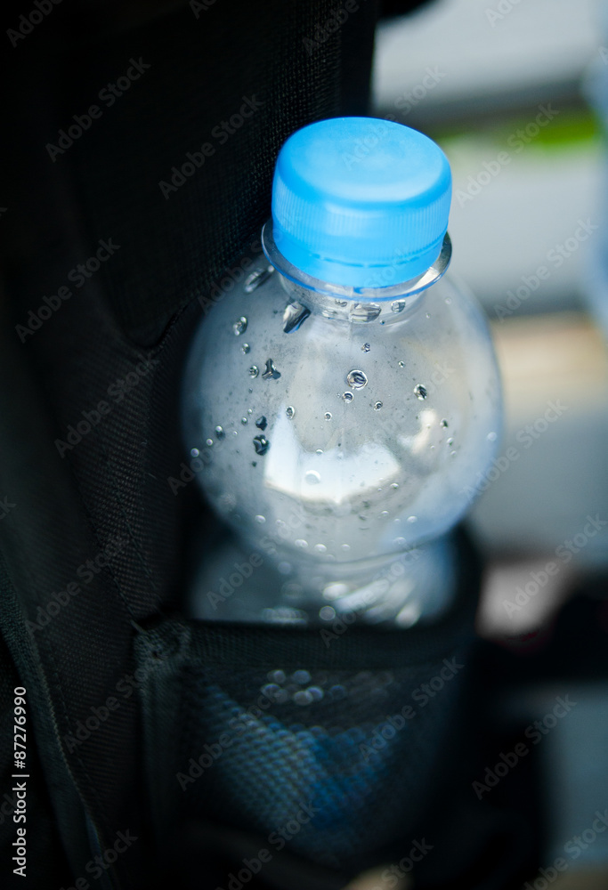 plastic bottle of water in pocket of backpack