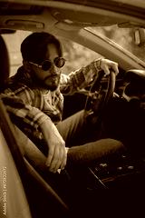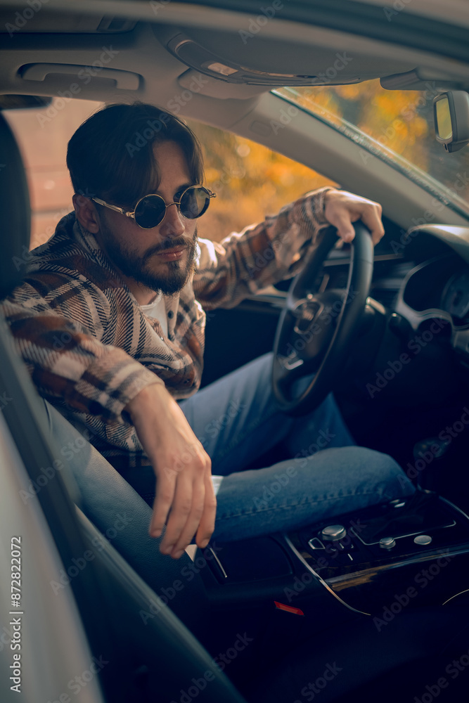 A stylish man in glasses sits behind the wheel, holding the steering wheel with the sun shining, emphasizing the use of sunglasses for driving safety against glare.