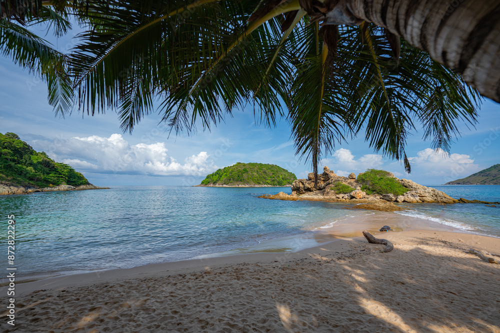 Peer through the coconut trees on the beach to see a small island surrounded by blue water..coconut palm trees at a tropical beach at Yanui beach Phuket.Beach Coconut Tree Images and Stock Photos..