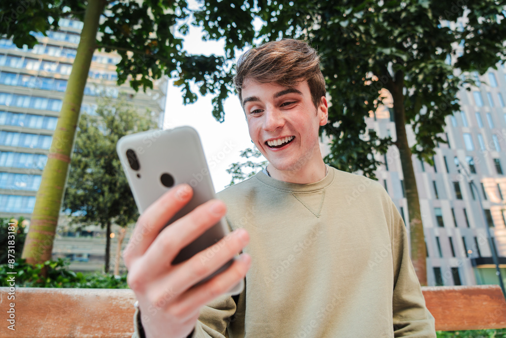 Teenager having fun using a cellphone outside. Carefree guy smiling and browsing on internet with a mobile phone app. Real young man watching and sharing on the social media on a smartphone device