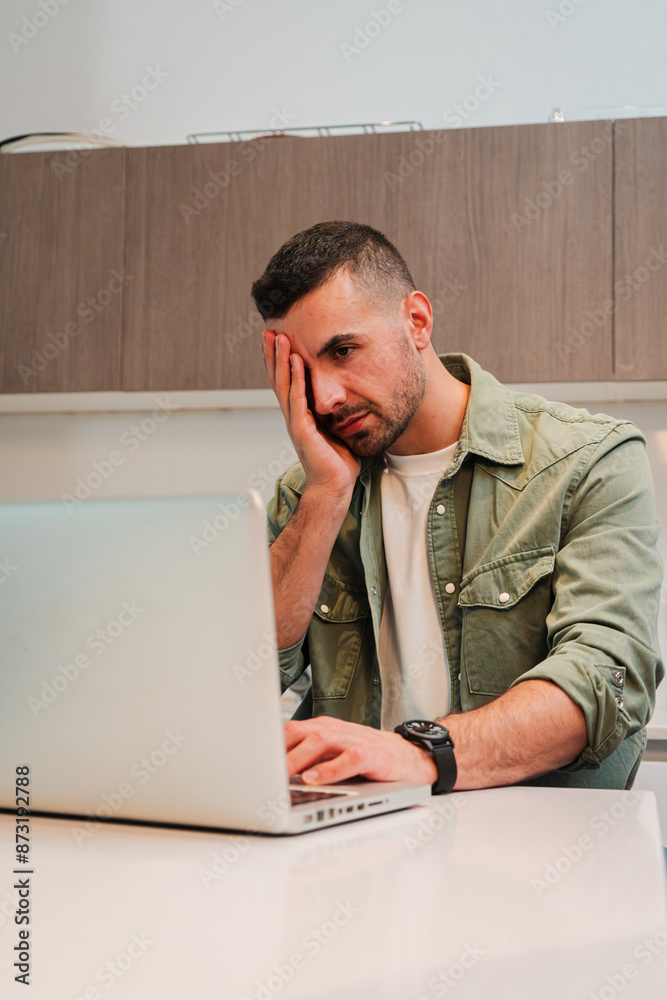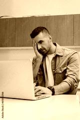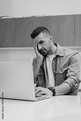 Vertical. Hard working man, desperate due to laptop issues causing her stress and headaches. A frustrated and burnout guy dealing with excessive work that triggers anxiety and migraines. Job problems