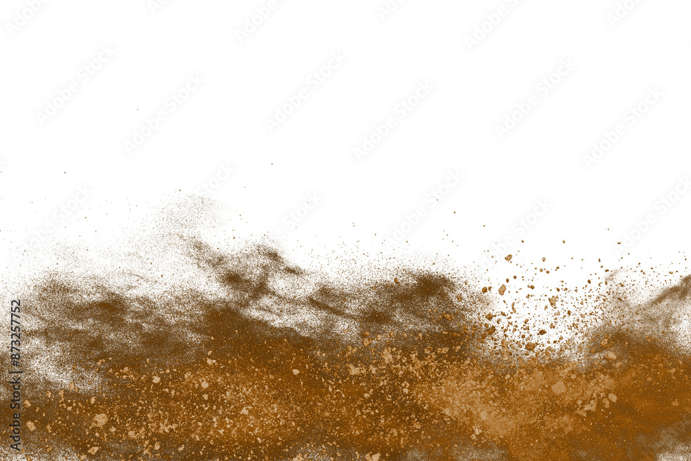 Brown powder explosion on white background. Colored cloud. Colorful dust explode. Paint Holi.