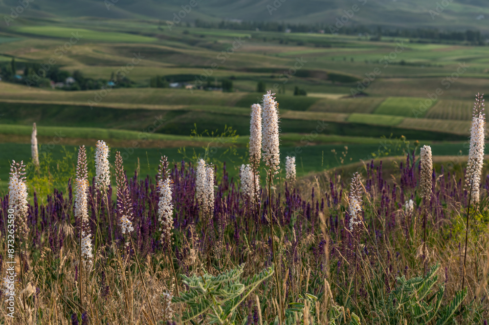 Flowering meadow on the hills with Eremurus Sage and meadow herbs. Selective focus.