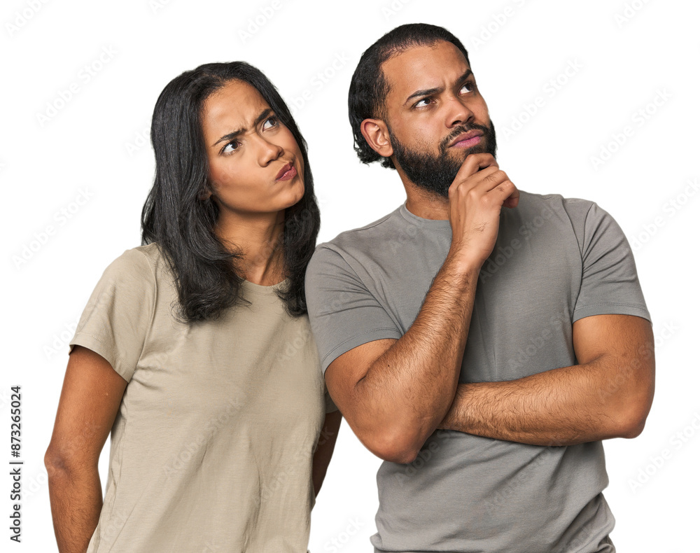 Young Latino couple in studio thinking and looking up, being reflective, contemplating, having a fantasy.