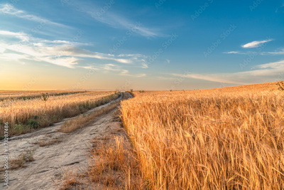 Dirt road among a field of ripe wheat and blue sky with clouds at sunset.Organic farming.