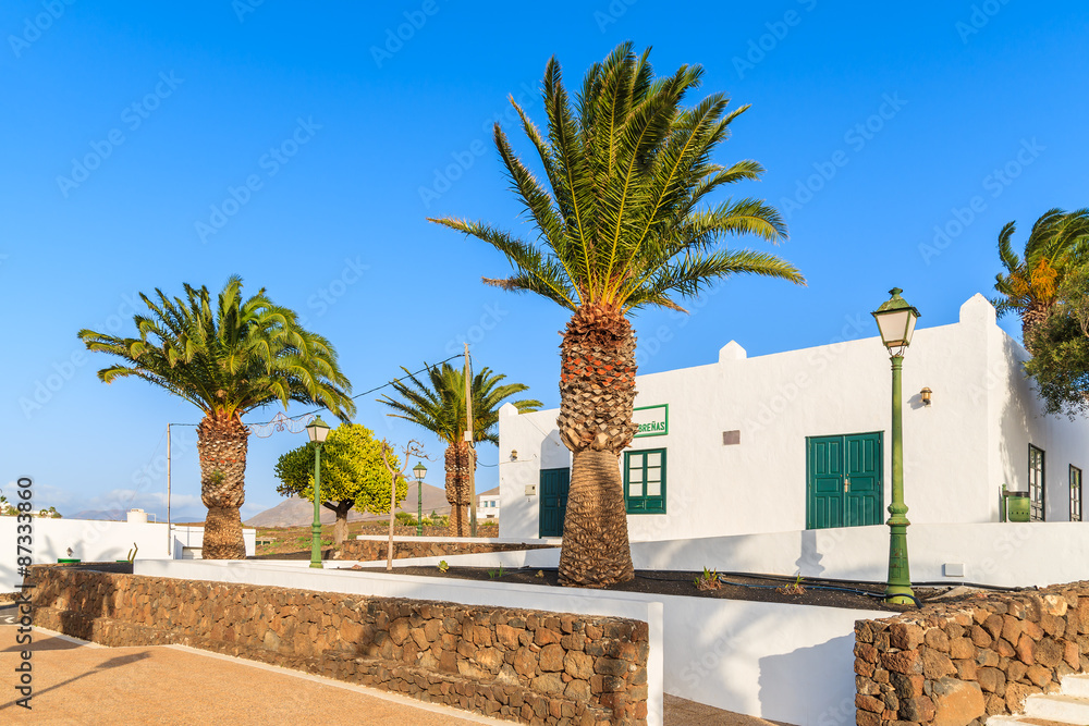Palm trees and typical Canarian houses in Las Brenas village, Lanzarote, Canary Islands, Spain