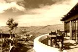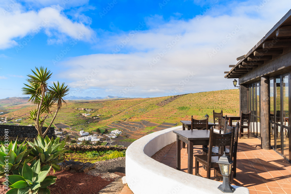 Restaurant terrace on Mirador de Los Valles - viewpoint in mountain landscape of Lanzarote island, Spain