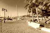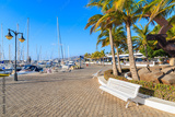 Bench on coastal promenade in Puerto Calero marina, Lanzarote, Canary Islands, Spain