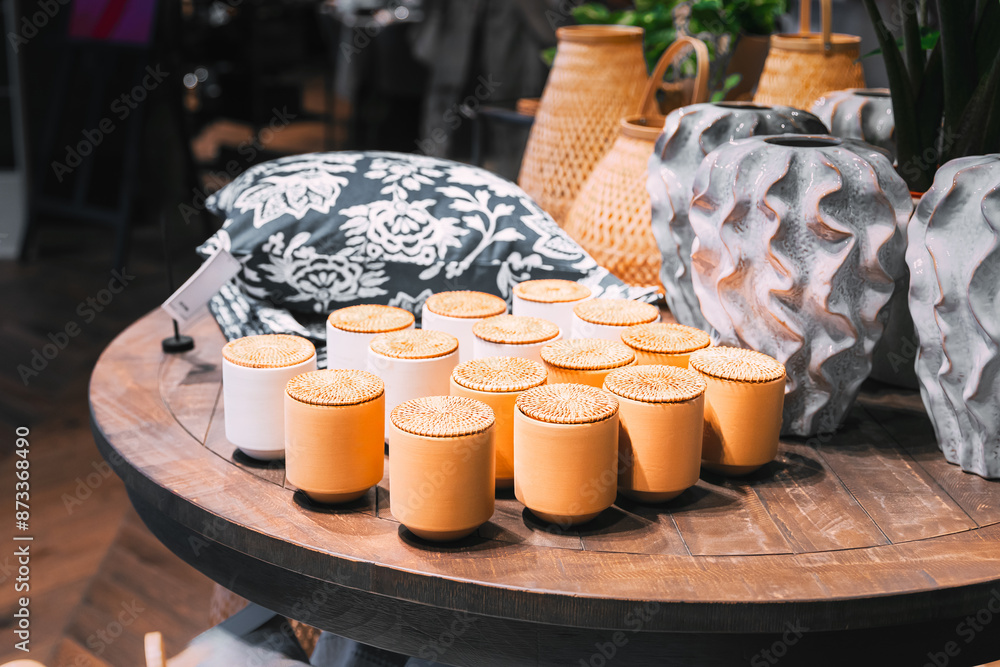 Scented candles and home Accessories In Shop Showcase Of Store Mall Market Shelf In Store. View of assortment of decor for interior shop in store of shopping center. Home accessories and household