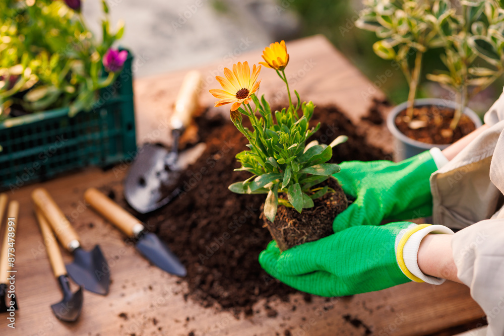 gardener plants flowers in the garden close-up, garden care, gardening concept