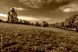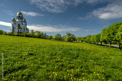 A church with golden domes against the sky on a summer day.