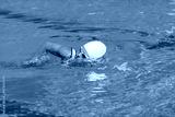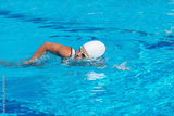 Female swimmer in white swim cap and goggles performing freestyle stroke in an outdoor pool, highlighting competitive swimming, athletic performance, and training