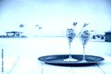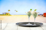 Mint ice cream in glass cups on a tray on wooden table on a sandy tropical beach. Copy space for products.