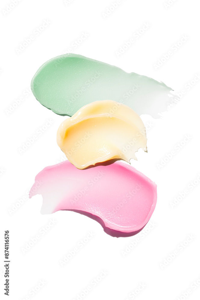 Lip balm (or make up cleansing oil butter balm washer) assortment set swatches multi colored green yellow and pink isolated on white
