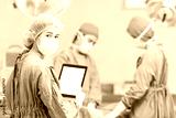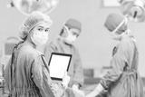 Young female woman nurse doctor surgeon using tablet computer with Surgical team team at operating room. looking at camera ,clipping path on tablet computer monitor