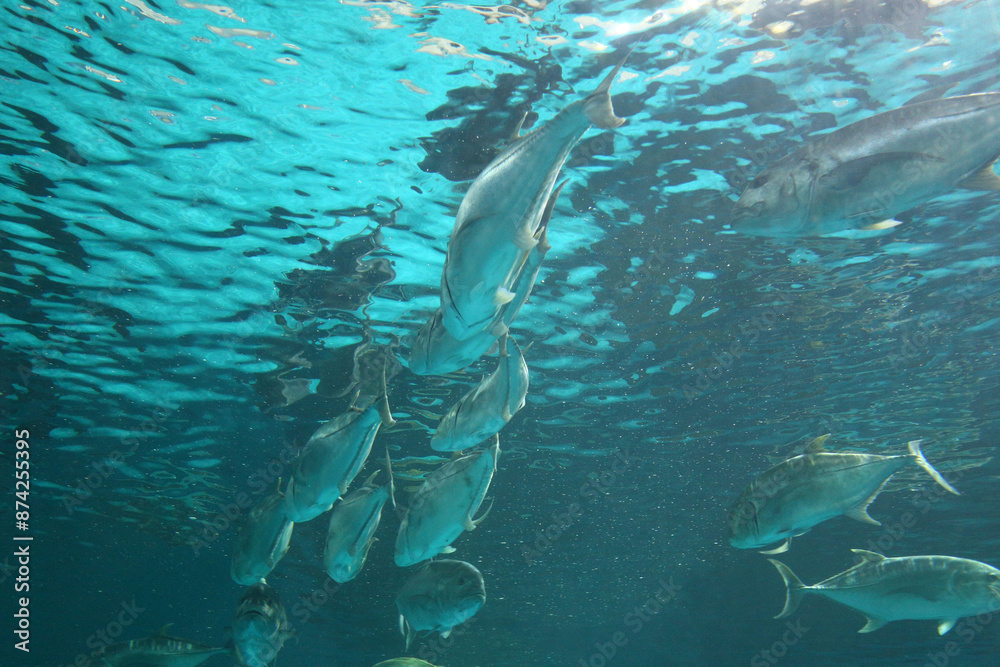 Caranx fishs of sea bass swimming together in groups, photographed from below.